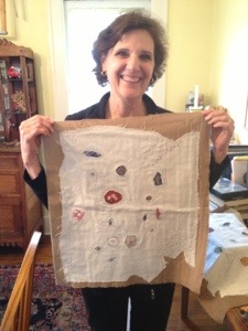 After the presentation, chapter president Helen Geglio hosted us for dinner at her charming home. The rugs, felted pillows and eclectic cheer of the home gave me the impression that Helen had a soft spot for textile art in her heart, which was confirmed as she showed us her most recent art experiments. These “sketches” were beautifully layered compositions of patterned fabrics quilted into a blanket of seeds. Looking forward to what these “sketches” will sprout into! Helen’s husband and Anna Bowers, another WCA member, also joined us for the delicious dinner of grilled chicken and asparagus, fresh guacamole, pasta salad, and a dessert of cake topped with strawberries and cream. Yum!