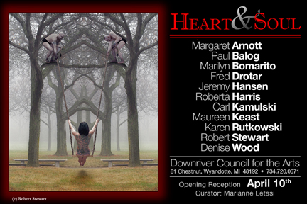 From April 10 to May 8, 2015, 11 talented artists will be exhibiting their latest work both inside and outside of the Downriver Arts Council Building, 81 Chestnut, Wyandotte, MI 48192. Curator Marianne Letasi has assembled a group of well known and accomplished artists from the area who will show sculpture, installation, collage, ceramics and painting.