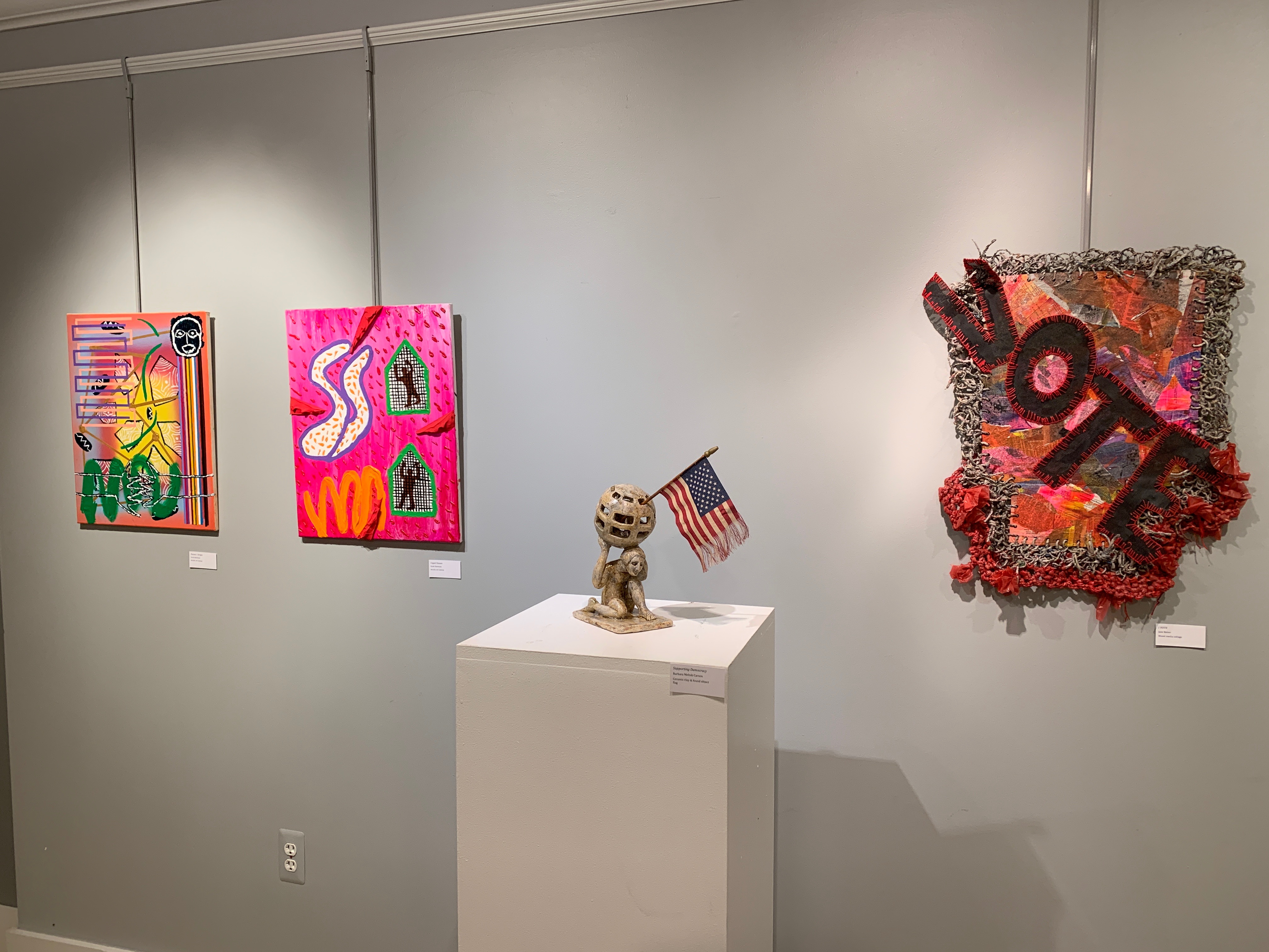 Previous Image Next Image IMG_0458 Person and Stripes, Caged Houses, by Scott Sherman; Supporting Democracy, by Barbara Carson; I VOTE, by Jane Reiter