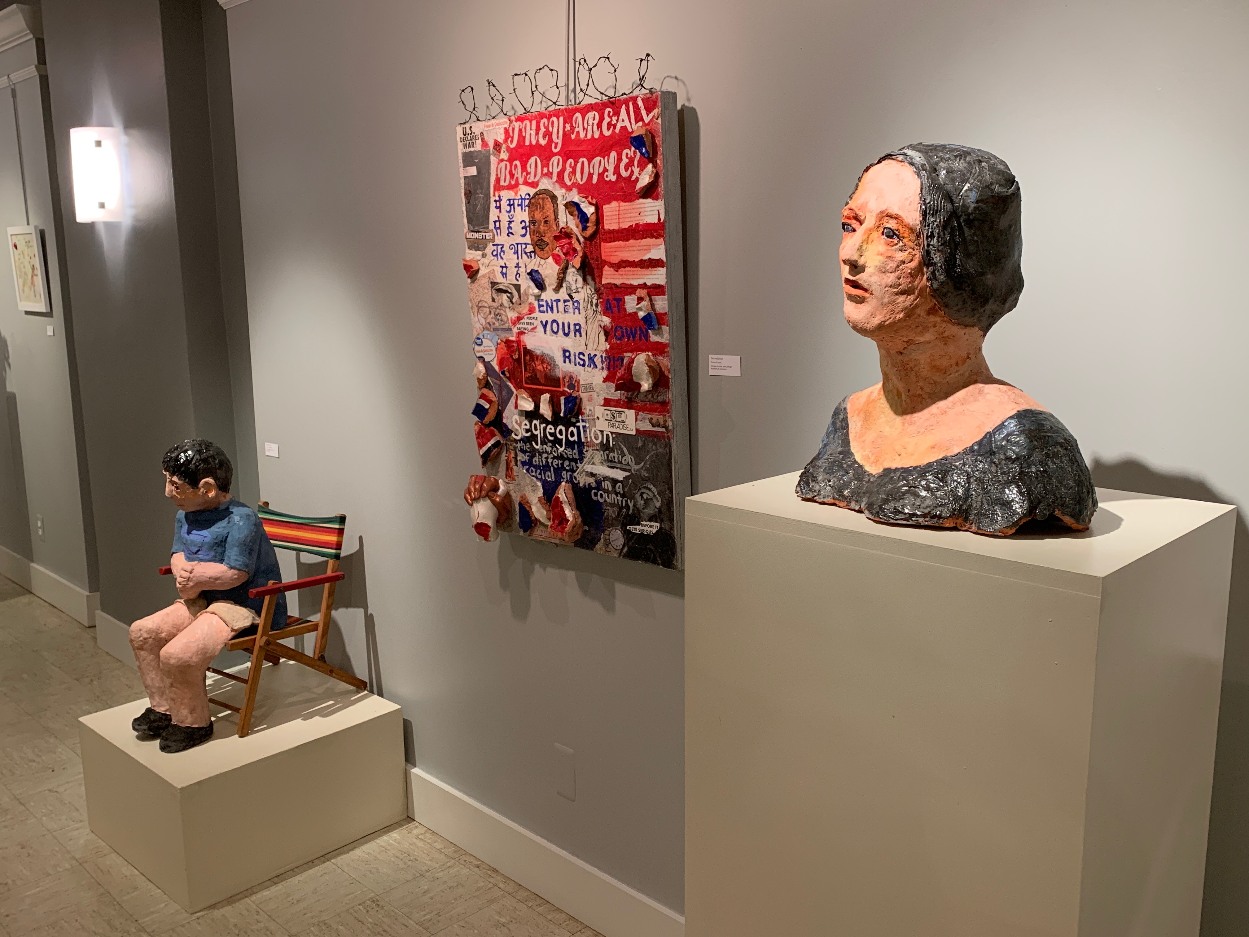 Previous Image Next Image IMG_0485 Migrant Child, by Marcia Polenberg; The wall piece, by Trisha Schultz; Madre, by Marcia Polenberg
